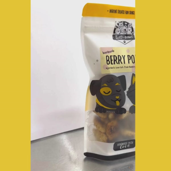 Each coin is handmade; lean fresh (not frozen) pork loin is ground in our kitchen to ensure only the best quality mince is used, then topped with a juicy piece of fresh strawberry or blueberry! Containing natural antioxidants, this makes for a vitamin packed treat, that's high in protein too.