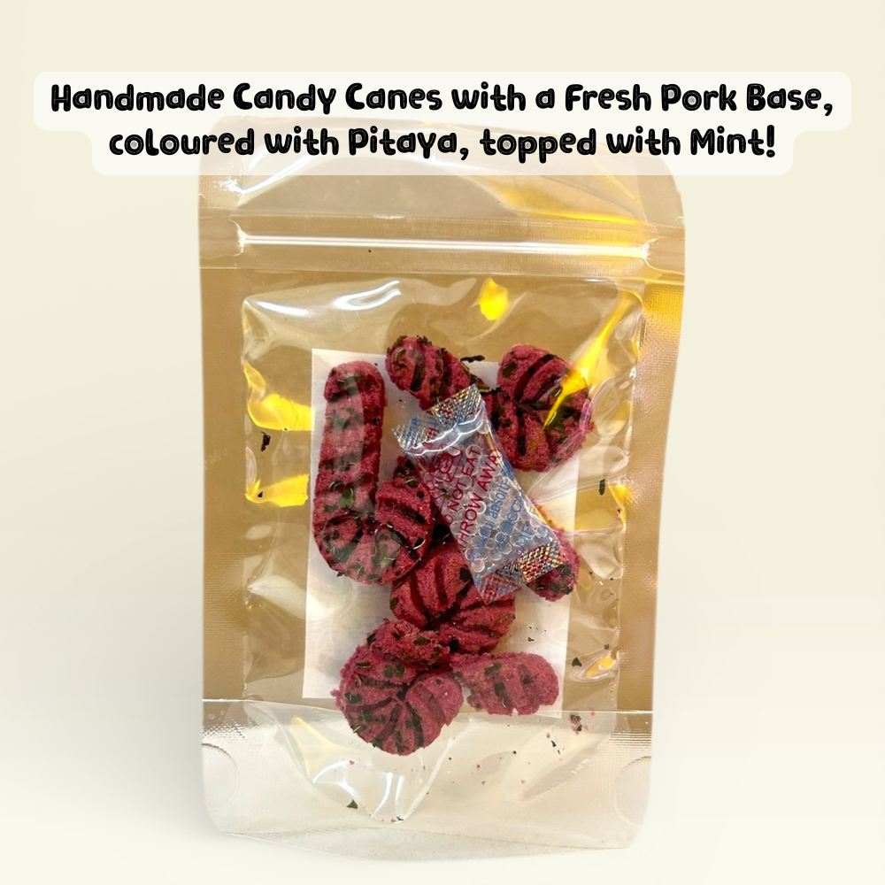 Handmade Candy Canes made with Fresh Pork and Yam, coloured with Pitaya, and topped with Mint! Easy-to-chew. Made for Dogs and Cats.