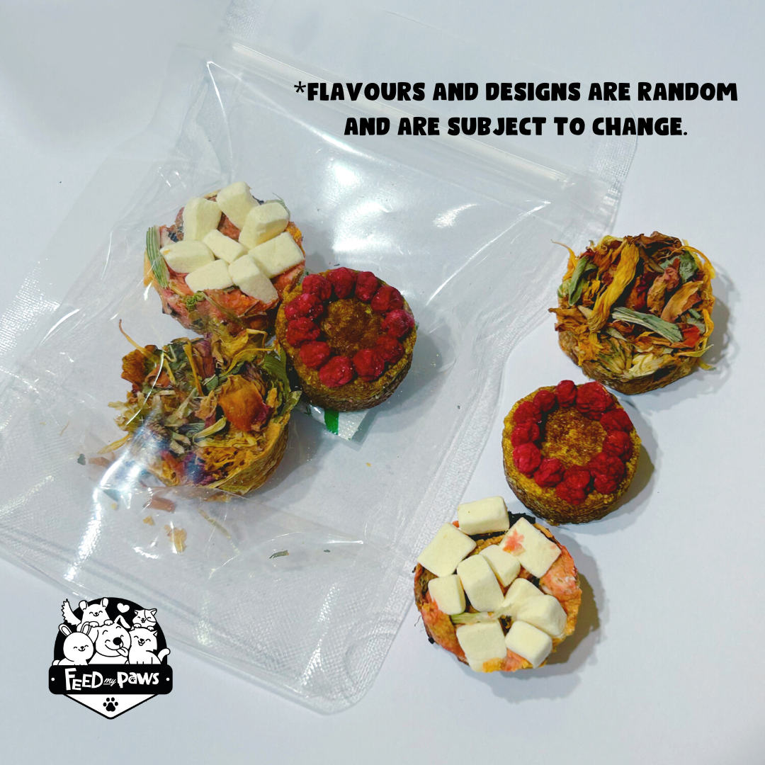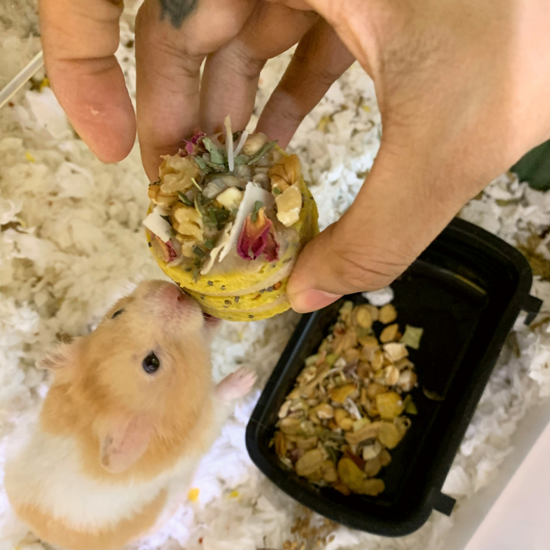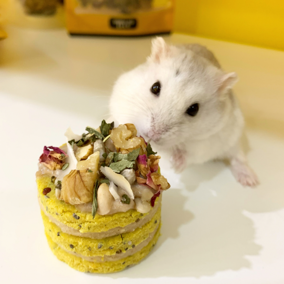 Made with organic raw nuts and seeds, fresh fruits, flowers, herbs, chicken, tofu, and more, our hamster mini cake is packed with nutrition and is bursting with flavour!